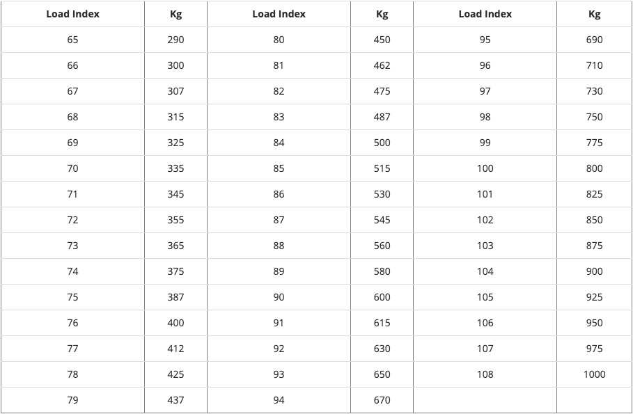 A numerical code referring to the maximum load the tyre can carry at the speed indicated by its speed symbol. In this example, the code is 91, therefore the maximum load per tyre is 615kg.