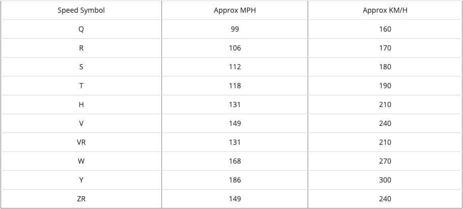 A letter which indicates the maximum speed at which the tyre can carry the load corresponding to the Load Capacity Index. In this example, the symbol is V, therefore the maximum speed is 149mph or 240km/h. Common speed symbols in the UK are ‘S’, ‘T’, ‘H’, ‘V’, ‘W’ and ‘Y’